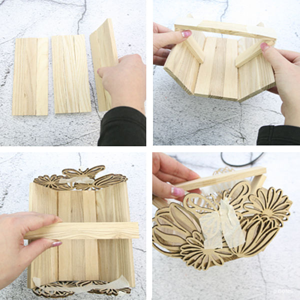 1. Für das raffinierte Körbchen drei Mal je 3 HolzSticks längs mit RubbelColl aneinanderkleben.
