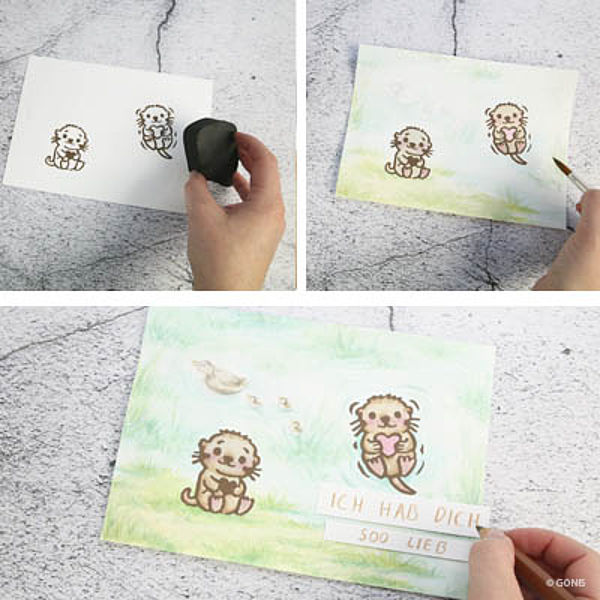 Material und Zubehör: EasyStamp Set Obersüße Otter (Kundengeschenk), OutdoorDecor Walnuss, Designkarton, Aqua-XXL Set, GoniColl