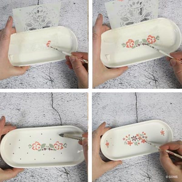 2. Das kleine Blumenmotiv einer Flexschablone des Layerschablonen Set mittig auf der Schale platzieren und mit den Farben des GlasDecor Set Mini Rustik Ostern ausmalen. Die Punkte mit dem spitzen SoftBrush in GlasDecor Mauve aufzeichnen.