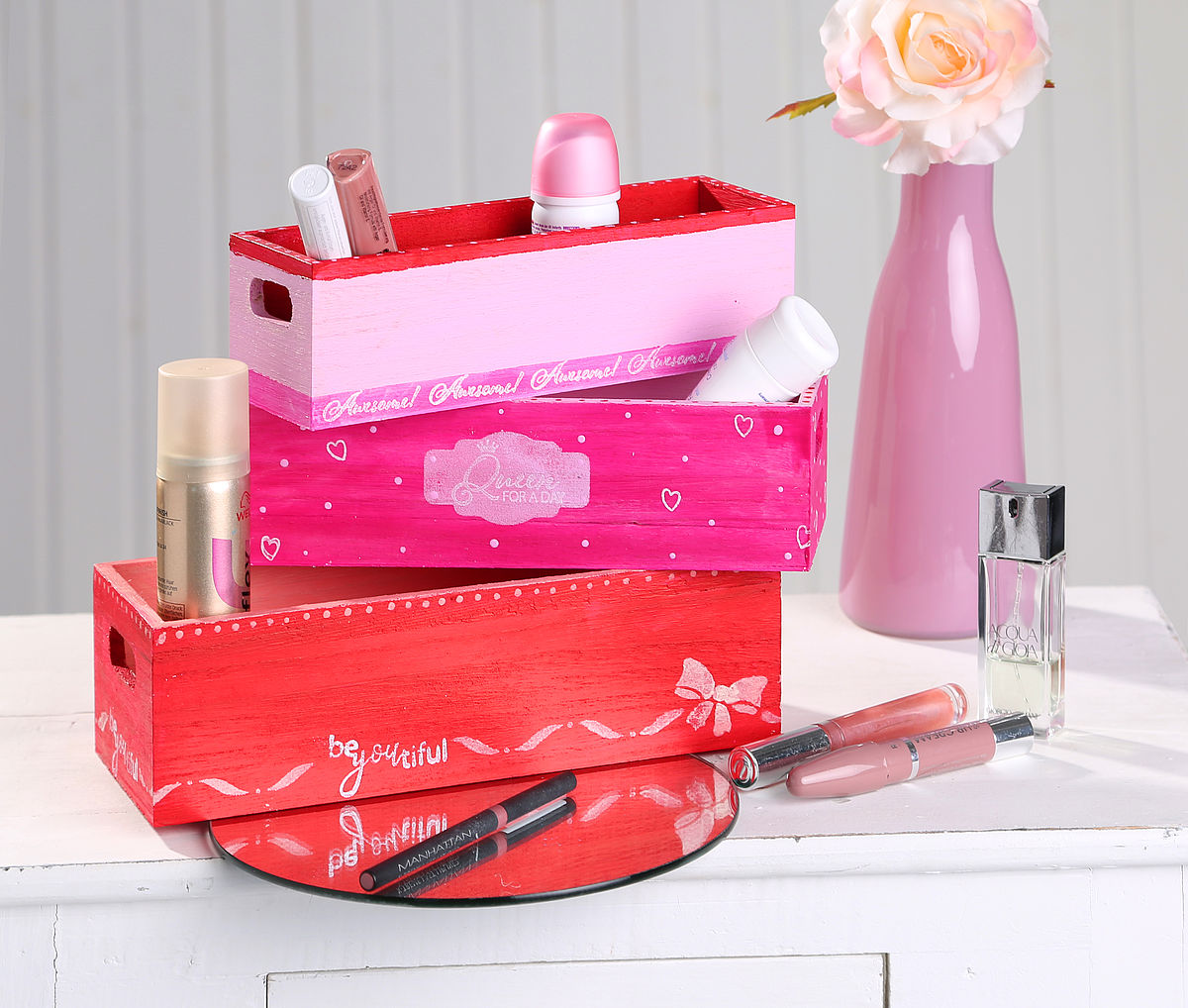 Avec notre idée déco nous voulons vous montrer l’une de nombreuses variantes, permettant à partir de nos boîtes vintage, de créer de superbes rangements pour sa coiffeuse.