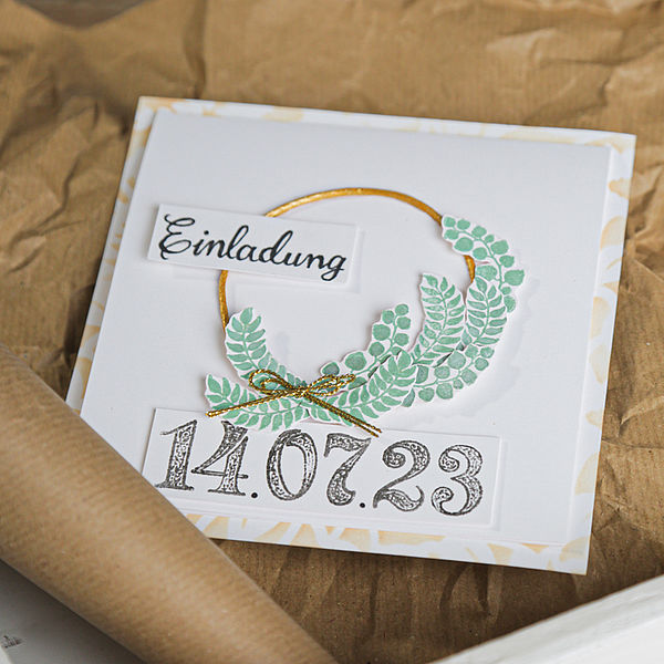 - Blätterranken mit InkPad Salbeigrün mehrfach auf ein Stück weißen Designkarton stempeln und ausschneiden. Mit Klebepunkten um den Kreis verteilen.