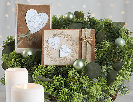 Quando è stata l'ultima volta che hai inviato una cartolina? Nell'era digitale, le cartoline sono un po’ passate di moda, ma noi pensiamo che non debba essere così. Tutti sono contenti di ricevere una cartolina personale, prodotta con affetto dalle mani di una persona cara, o sbaglio? Per la cartolina ti serve il nostro timbro Saluto natalizio, InkEffekt crema ed eucalipto, la fustellatrice cuore, RubbelColl, Designkarton naturale e bianco, forbici e puntini adesivi GoniColl.